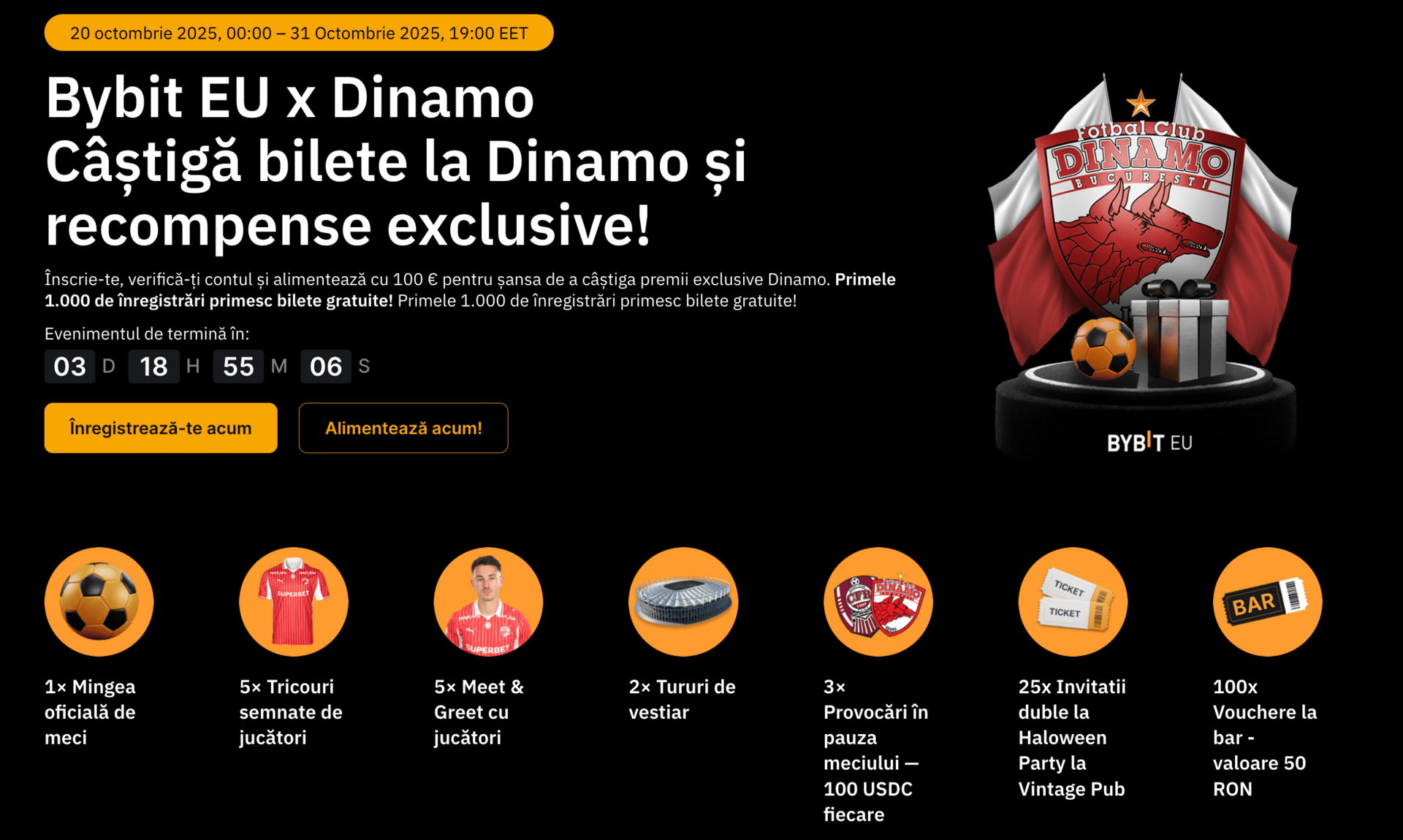 Prin parteneriatul cu Dinamo, Bybit EU oferă bilete gratuite la meciul Dinamo - CFR Cluj, care are loc vineri, 31 octombrie, ora 20:30. Pe lângă bilete, ai șansa să câștigi mingea oficială a meciului, tricouri semnate de jucători, meet & greet cu aceștia sau tururi de vestiar. În plus, mai există vouchere, invitații duble la Halloween Party-ul de la Vintage sau provocări în pauza meciului.